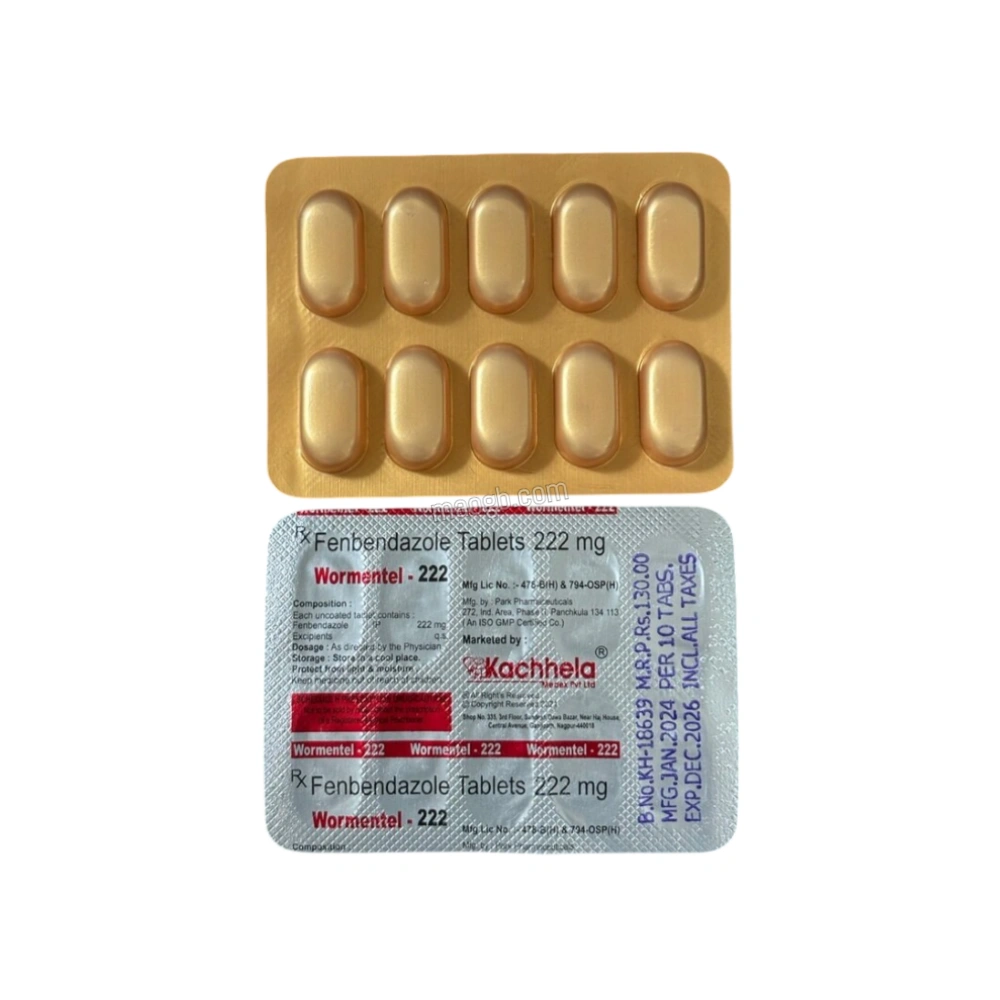 Wormentel 222mg Fenbendazole Tablets is a broad-spectrum antiparasitic medication formulated to treat intestinal worm infections in animals. It contains fenbendazole as the active ingredient, which belongs to the benzimidazole class. This formulation is commonly used in veterinary practice for effective parasite management.